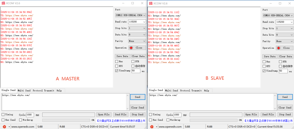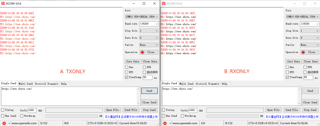 Serial communication can be achieved using a serial port assistant. Example configurations for TXONLY and RXONLY are as follows: Module A (TXONLY), Module B (RXONLY)