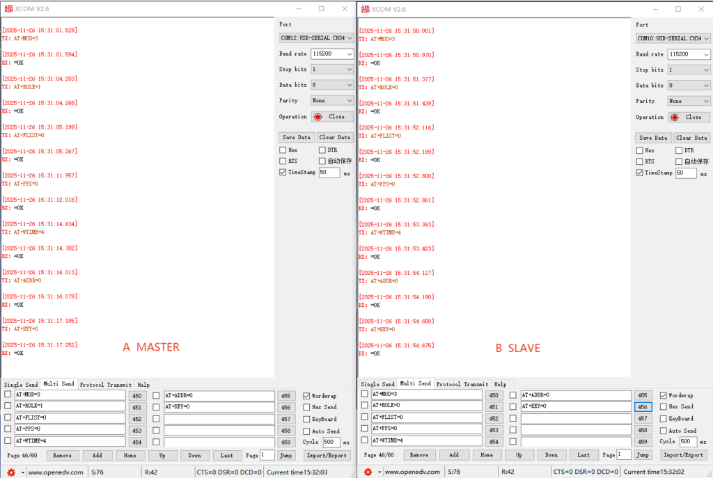 ⑤ AT+PPS=0 (Set whether to enable hardware synchronization, requires external hardware support, master and slave remain consistent)