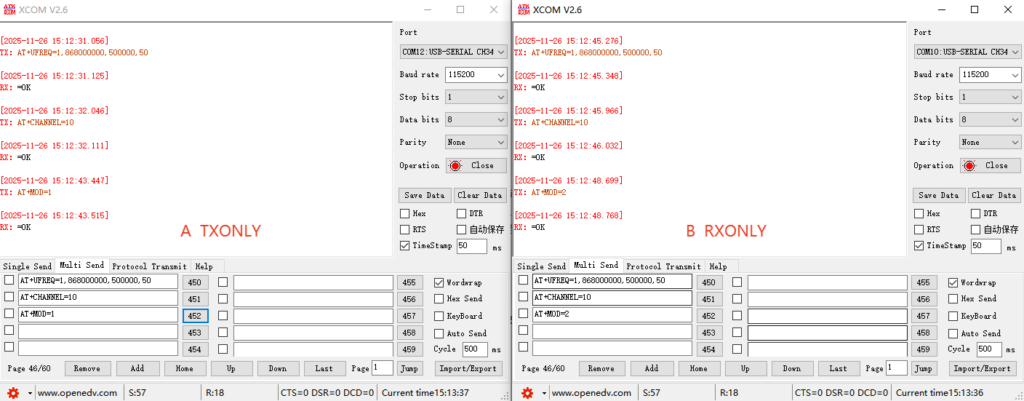 ④ Module A: AT+MOD=1 (Set transmission mode to TXONLY) Module B: AT+MOD=2 (Set transmission mode to RXONLY)