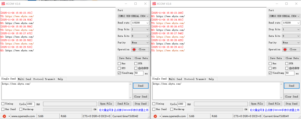 DUPLEX Mode: In this mode, bidirectional data transmission is possible (the module can both send and receive wireless data). What you send is what you get. Communication can be achieved using a serial port assistant. Example setup: