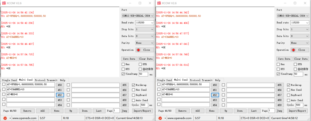 ②AT+UFREQ=1,868000000,500000,50 (Configure the fixed-frequency transmit/receive custom frequency start, channel interval, and number of channels in configuration mode);